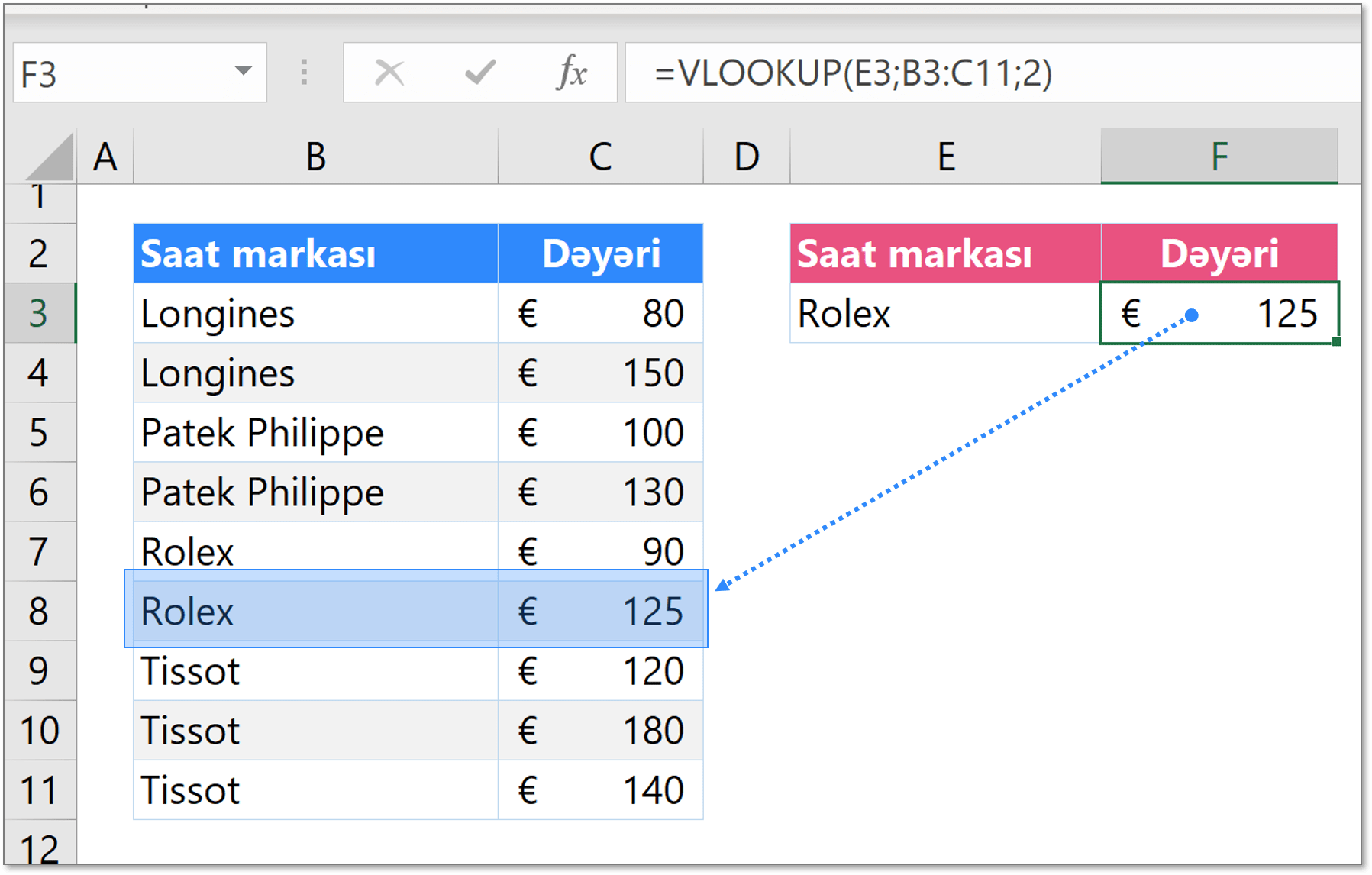 Nə qədər qəribə səslənsə də, axtarılan dəyərə aid diapazonun əlifba sırasına görə sıralanıb-sıralanmaması, nəticəyə ciddi təsir göstərəcəkdir. Məsələn, yuxarıdakı misalımızda, saat markaları əlifba sırasına görə sıralanmışdır və belə olan halda, gəlin, TRUE və ya FALSE komponentinin hansı nəticəni verəcəyinə baxaq.