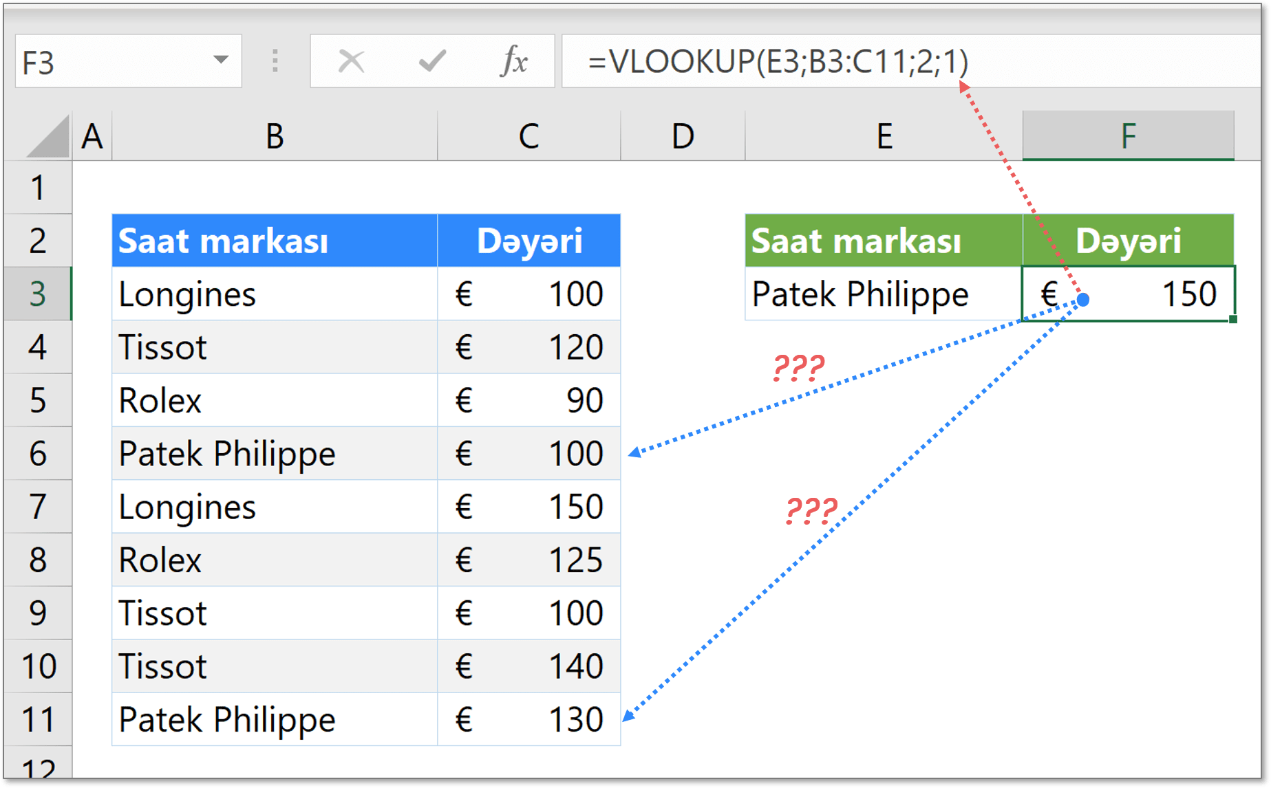 Yuxarıdakı misaldan da görürük ki, Patek Philippe saat markasını sıralanmamış diapazon daxilində TRUE (yəni 1) komponenti ilə axtarsaq, o zaman o markaya aid olmayan bir dəyərlə qarşılaşacağıq. Formul bizə 150 nəticəsini verdi, halbuki o saata aid cəmi 2 dəyər var: 100 və 130.